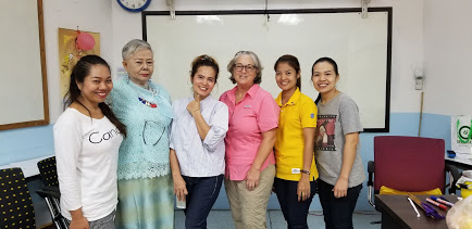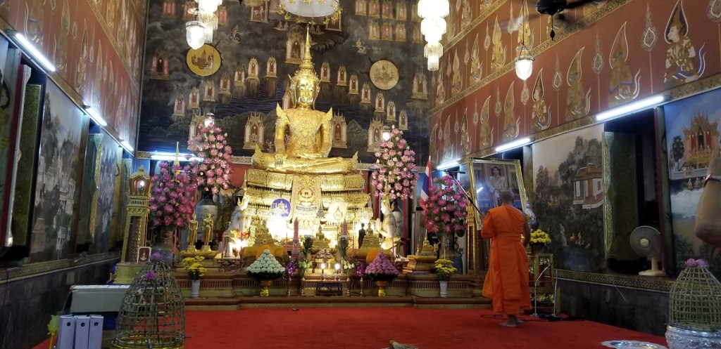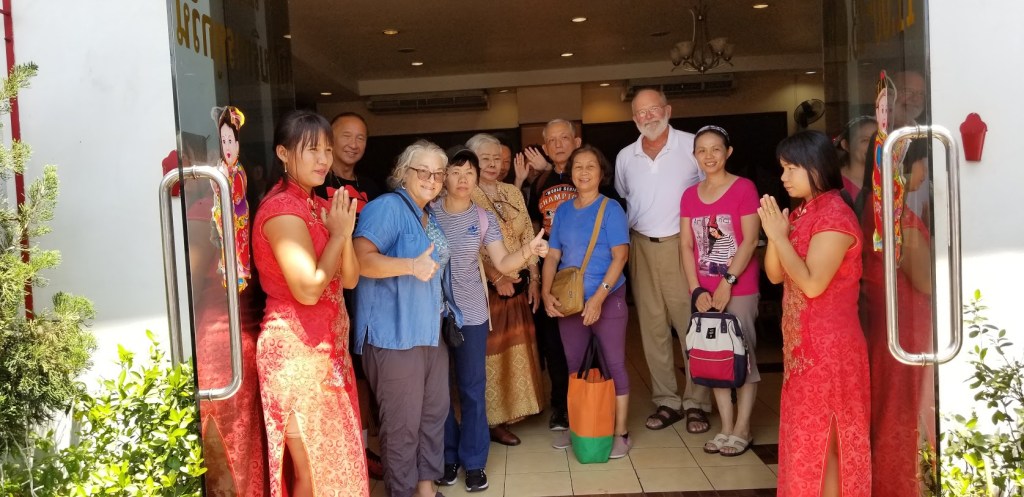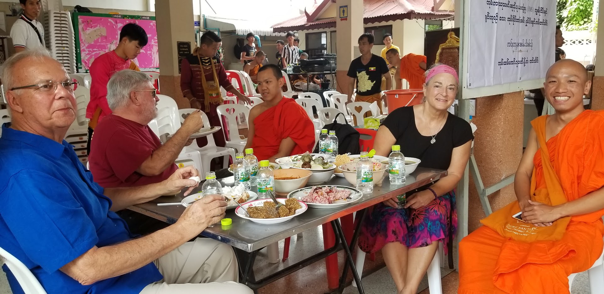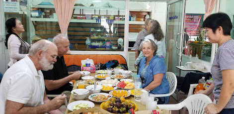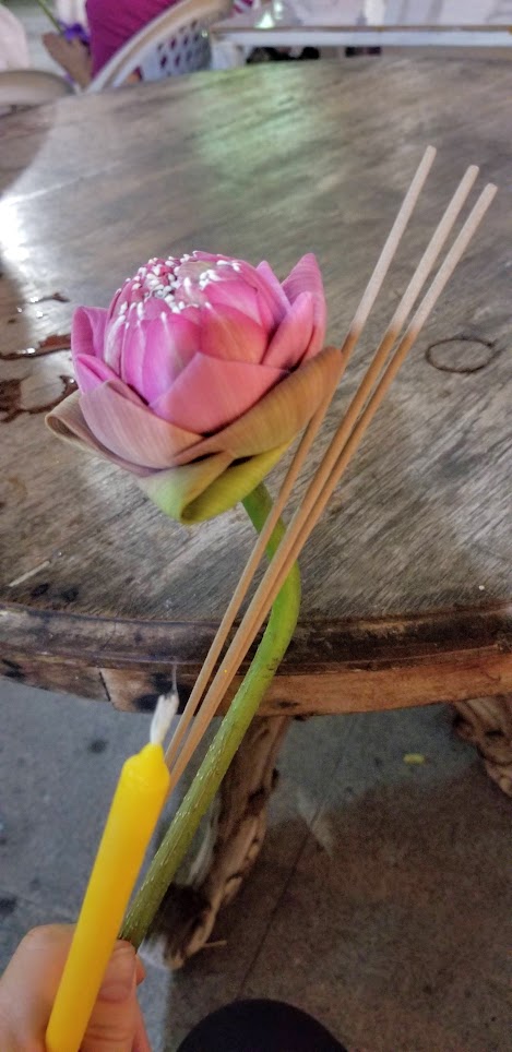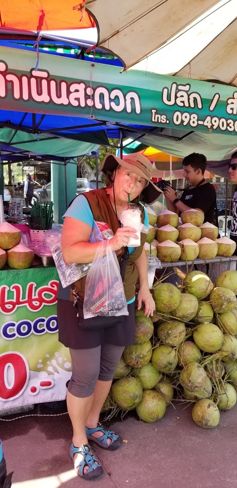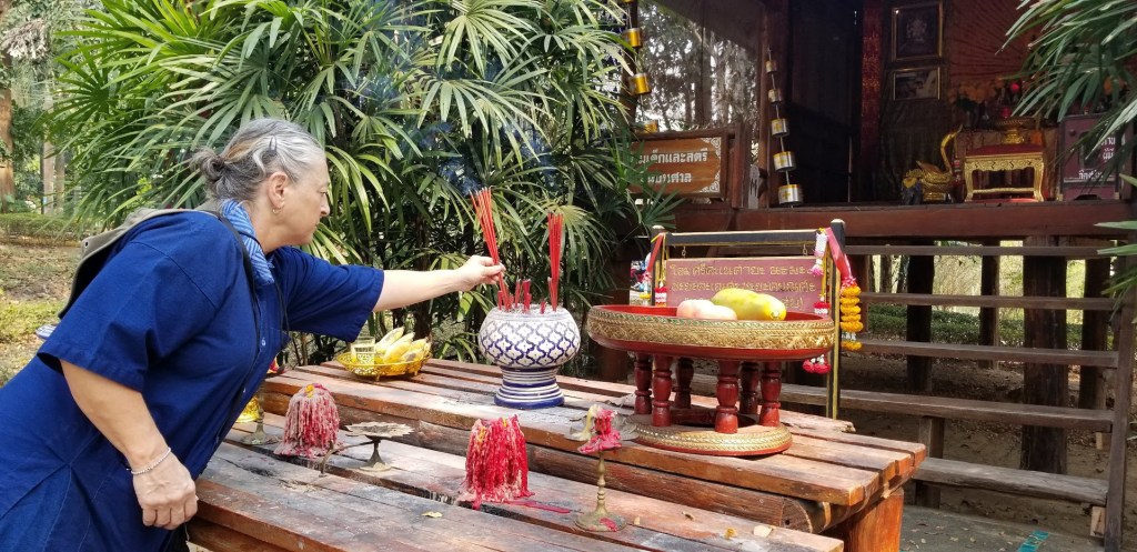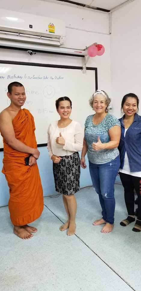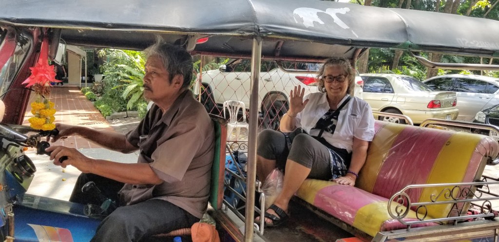 We were invited to one of my students home to help celebrate her husbands 80th birthday. When we arrived, the monks were there chanting over the birthday boy. Before the monks left, one of them provided holy water blessings on our heads, I mean not just a sprinkle like the Catholic Priests but a bunch of bamboo sticks slapped on your head! The food buffet was amazing, I especially liked the pumpkin in coconut milk dessert. At the dinner table were my students’ grown children who speak Thai, their cousins from China who only speak Chinese, and us Americans who only speak English. It made for interesting conversations . . . thank you “google translate”! I had my first tuk tuk ride back to our apartment. Locals don’t typically use tuk tuk’s since they inflate their prices.