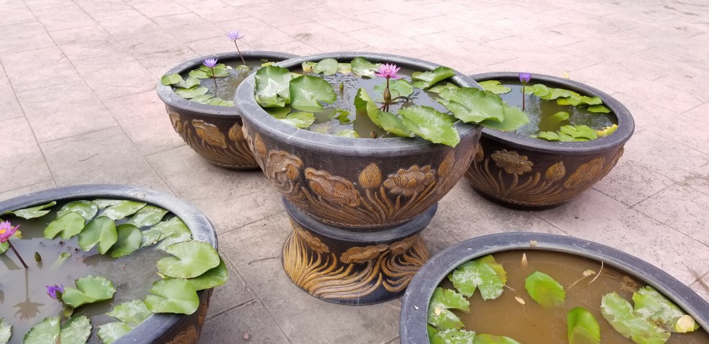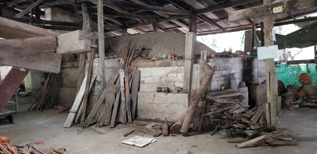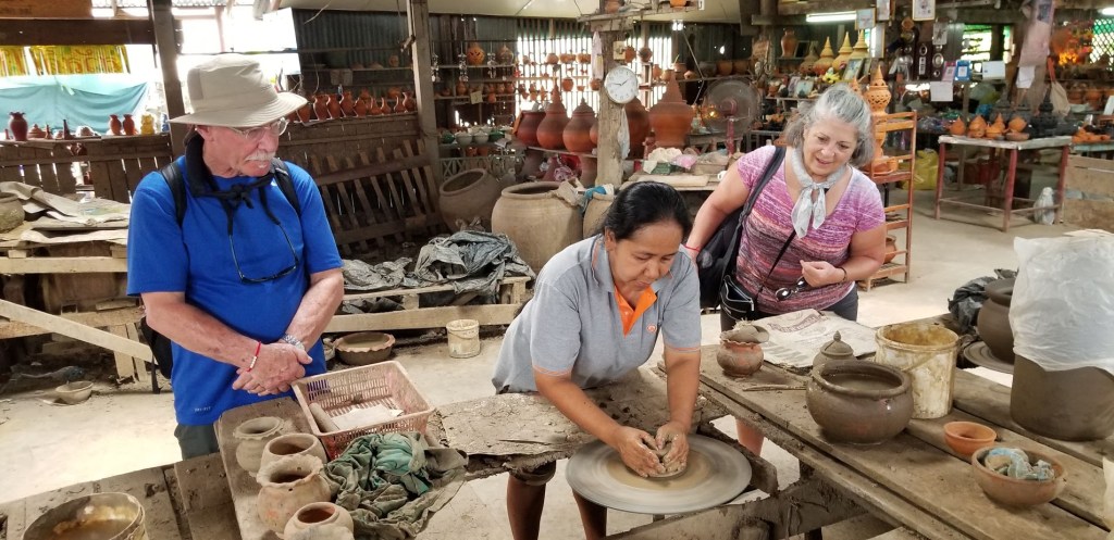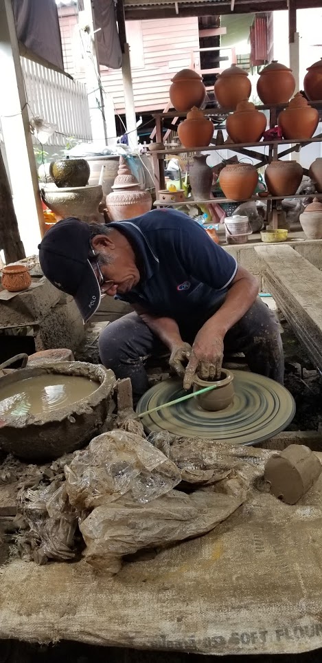 On my birthday we visited Ko Kret , a 1 sq. mile island created during the Ayutthaya period. It is populated by the Mon people whom were given refuge there when they fled the kingdom of Pegu, in Burma, after the Burmese king Alaungpaya destroyed it in 1757. We took the express boat along the Chao Phraya river from our starting point Pier -2 to Pier 30. From there, the three of us travelling together hired a half-size longtail boat for the 20 minute ride to Ko Kret. The boat made for a high-powered, exhilarating and bumpy ride! Ko Kret is best known for its Mon pottery, which is intricately designed, unglazed and colored orange or blackish -grey.