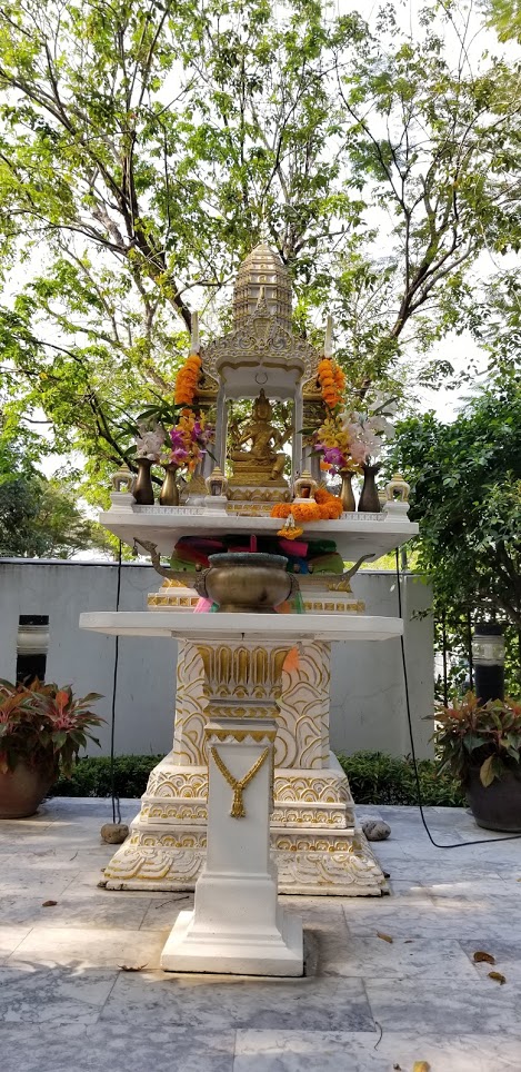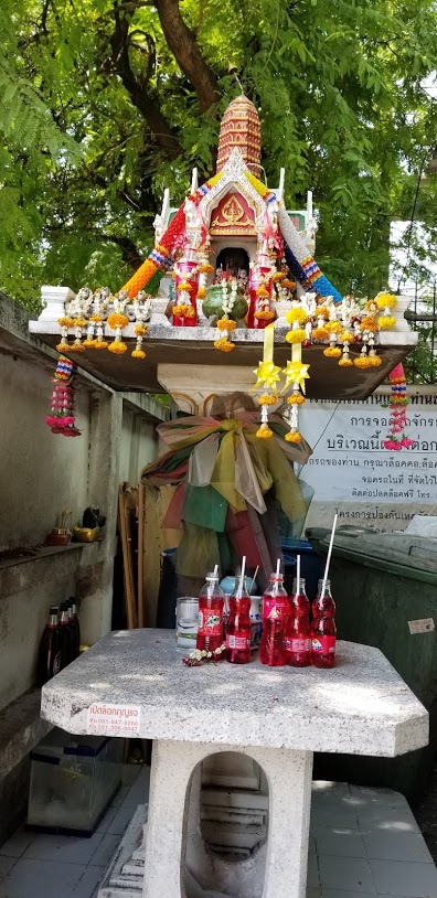Spirit Houses are seen outside homes, businesses and other buildings as a shrine to protect the spirit of the place. Oftentimes, they are located next to a tree. The spirit house is normally in the form of a small Thai architecture roofed structure and is mounted on a platform. We saw one the other day that was adorned with women’s clothing because the people believe that particular spirit is a woman. Visitors to the spirit house bring candles, incense, flowers, food and drinks, etc.