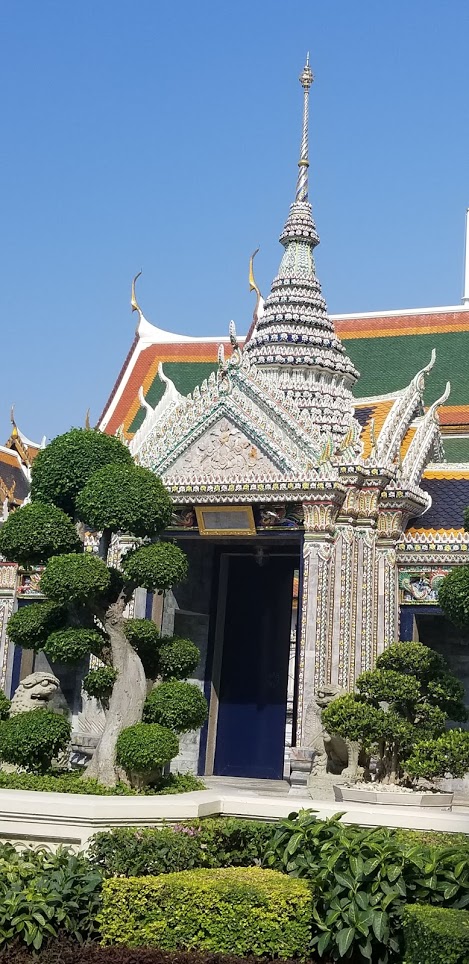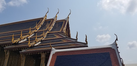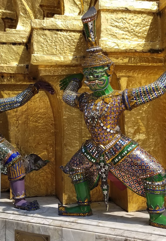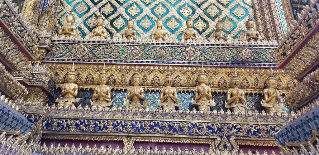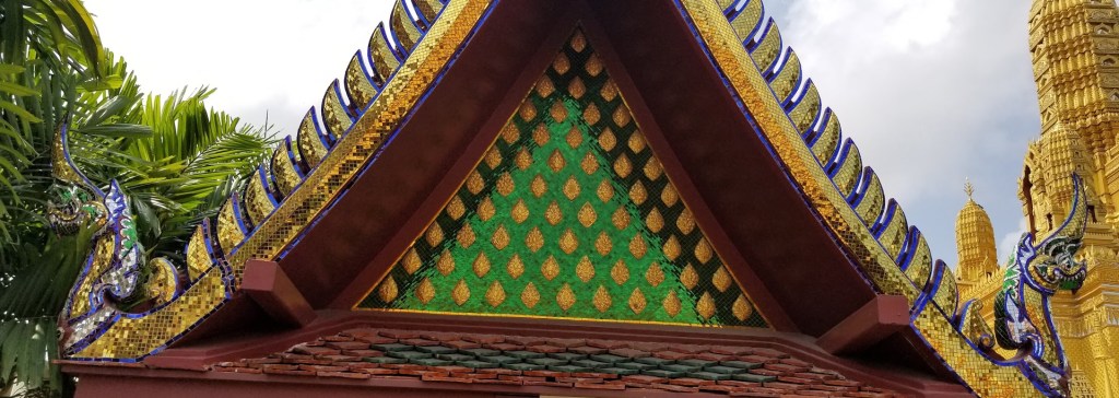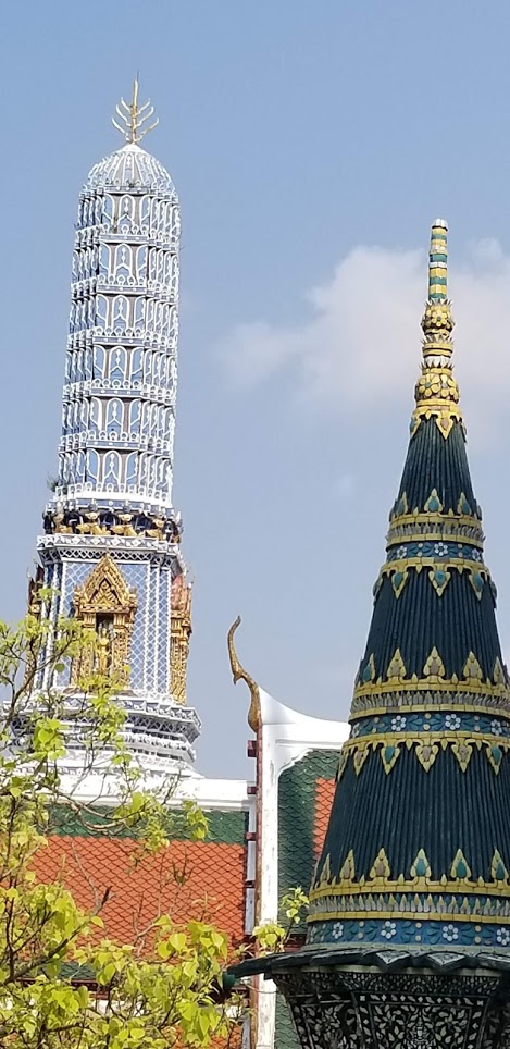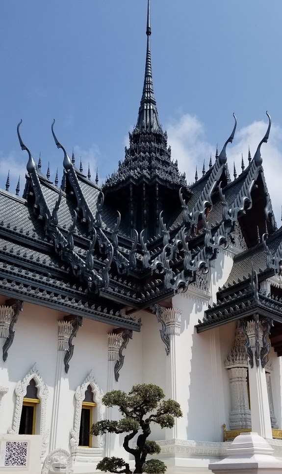 The architecture of Thailand is AMAZING! It is important to the country’s culture as well as it’s religious beliefs. I am drawn to the symmetry of the structures. Prior to visiting Wat Phra Kaeo, Phra (Monk) Suraphet gave us an overview on the different components of Thai architecture, mostly as it relates to a Thai temple. The Buddhist temple is not just one building, but often a collection of buildings, shrines, and monuments within a courtyard that is enclosed by a wall that divides it from the secular world. Regardless of how plain or ornate the temples are, they usually consist of several buildings that contain similar elements: Boundary Stone, Assembly Hall, Stupa/Chedi/Vihara, Corn Cob Shape Stupa (Cambodian style), Bell Tower and a Pavilion with a pyramidal roof. My pictures below capture the typical roof lines of a temple and some of the monuments mentioned. Phra Suraphet explained that from an architectural standpoint, sometimes in Thailand you cannot separate Buddhism and Hinduism. Multiple roof tiers are an important element of the Thai temple. Perched on the peak is a large curving ornament which resembles the beak of a Garuda. The Garuda is described as a legendary bird or bird-like creature and is also the national emblem of Thailand. On the lower tiered roof lines is the Naga head (serpentine). In Buddhism, both animals protect Dharma (the teachings of the Buddha).