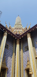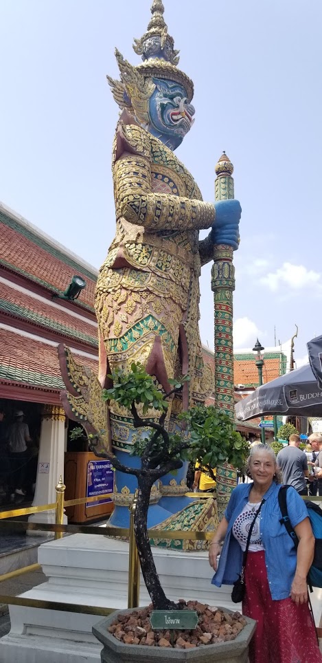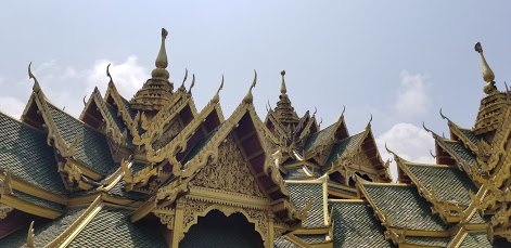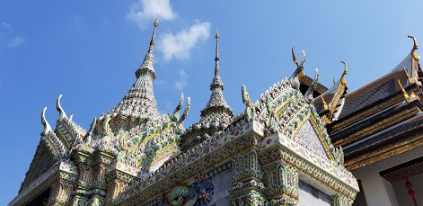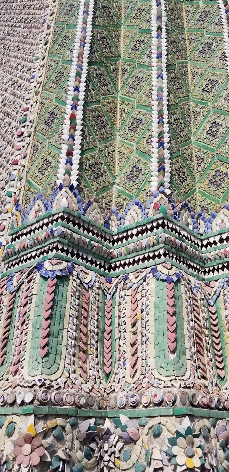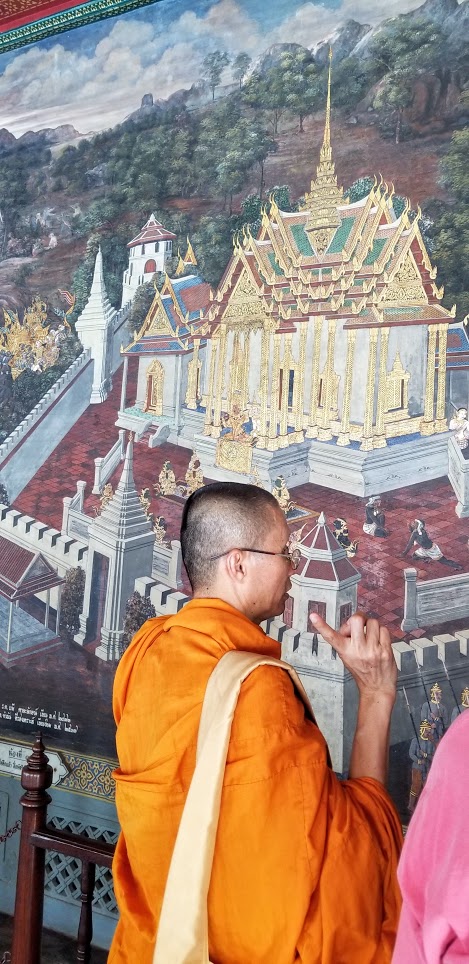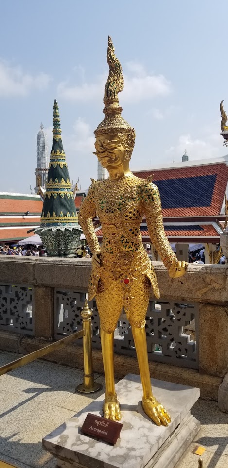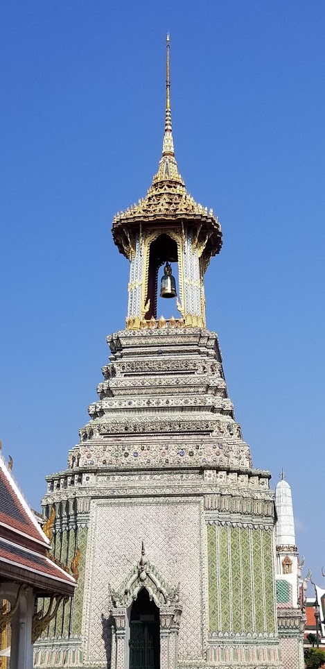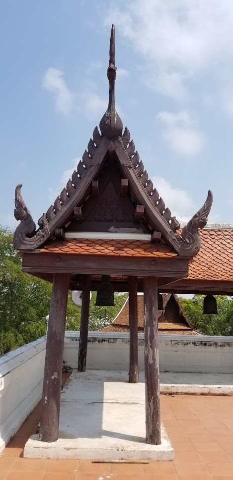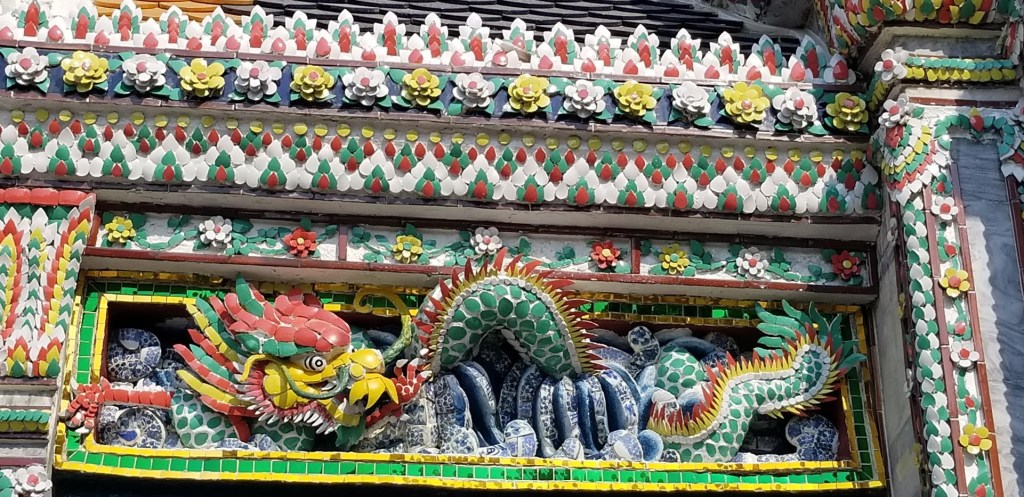The architecture of Thailand is AMAZING! It is important to the country’s culture as well as it’s religious beliefs. I am drawn to the symmetry of the structures. Prior to visiting Wat Phra Kaeo, Phra (Monk) Suraphet gave us an overview on the different components of Thai architecture, mostly as it relates to a Thai temple. The Buddhist temple is not just one building, but often a collection of buildings, shrines, and monuments within a courtyard that is enclosed by a wall that divides it from the secular world. Regardless of how plain or ornate the temples are, they usually consist of several buildings that contain similar elements: Boundary Stone, Assembly Hall, Stupa/Chedi/Vihara, Corn Cob Shape Stupa (Cambodian style), Bell Tower and a Pavilion with a pyramidal roof. My pictures below capture the typical roof lines of a temple and some of the monuments mentioned. Phra Suraphet explained that from an architectural standpoint, sometimes in Thailand you cannot separate Buddhism and Hinduism. Multiple roof tiers are an important element of the Thai temple. Perched on the peak is a large curving ornament which resembles the beak of a Garuda. The Garuda is described as a legendary bird or bird-like creature and is also the national emblem of Thailand. On the lower tiered roof lines is the Naga head (serpentine). In Buddhism, both animals protect Dharma (the teachings of the Buddha).