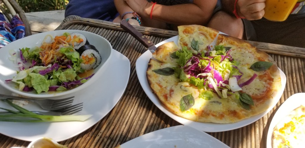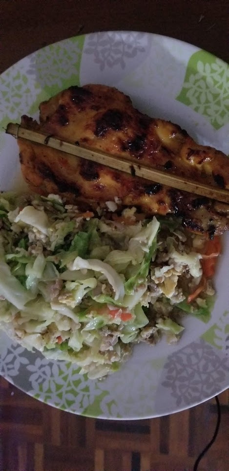 BBQ chicken between bamboo sticks and Vegi dish from the market next to our apartment
