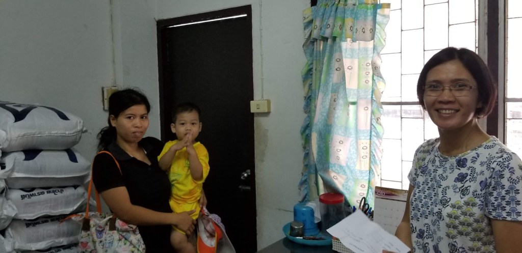 This week I visited the Maryknoll Urban Asylum Seeker/Refugee food distribution office. It’s one thing to learn and read about this work but to witness the refugees and to hear their stories first hand is very emotional. Arlene and Tik do a wonderful job organizing the operation and attempting to fairly distribute food items. Maryknoll helps the Urban Asylum Seekers/Refugees, particularly the asylum seekers registered with the United Nation High Commissioner on Refugees (UNHCR). When they enter the office, they show their UNHCR ID and sign-in on the registration form which lists their UNHCR number, name, nationality, status (single/family), number of children and whether they are an asylum seeker or refugee. Each person gets rice, sugar, milk, noodles, and cooking oil, then, based on their nationality preference, they get either rice noodles or flour and sardines. On the registered list were people from Cambodia, Sri Lanka, Pakistan, Vietnam, Ethiopia, Somalia, Afghanistan, Iraq, Sudan and Tanzania. Mostly the woman pick up the food because they say it is safer since their husbands would be more likely to get arrested. The women are very strong carrying two big bags of rice, the food items and sometimes a child.