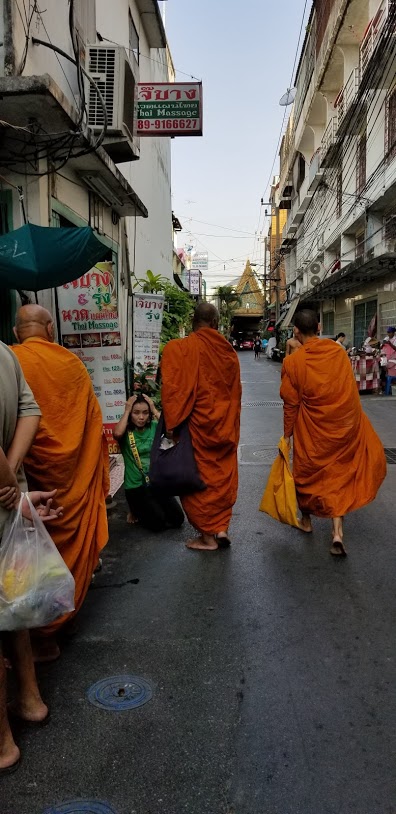 Yesterday was Ash Wednesday. During this time, we prepare for the death and resurrection of Jesus Christ and observe the three pillars: prayer, fasting and almsgiving. On most mornings as we ride on the back of the songtaew (red pick-up truck with two benches in the back) to the Wat where we teach class, we see the monks from our Wat making their food-gathering rounds. On their morning rounds, each monk walks silently, eyes downcast, barefoot, along the neighborhood streets. He carries his alms bowl, often suspended by a sling across one shoulder.