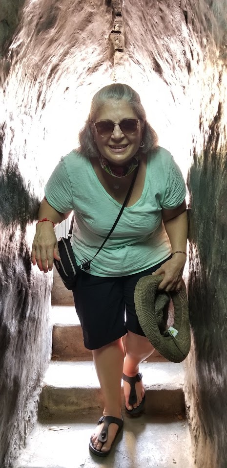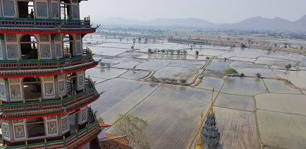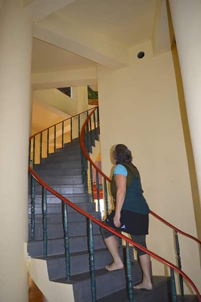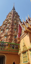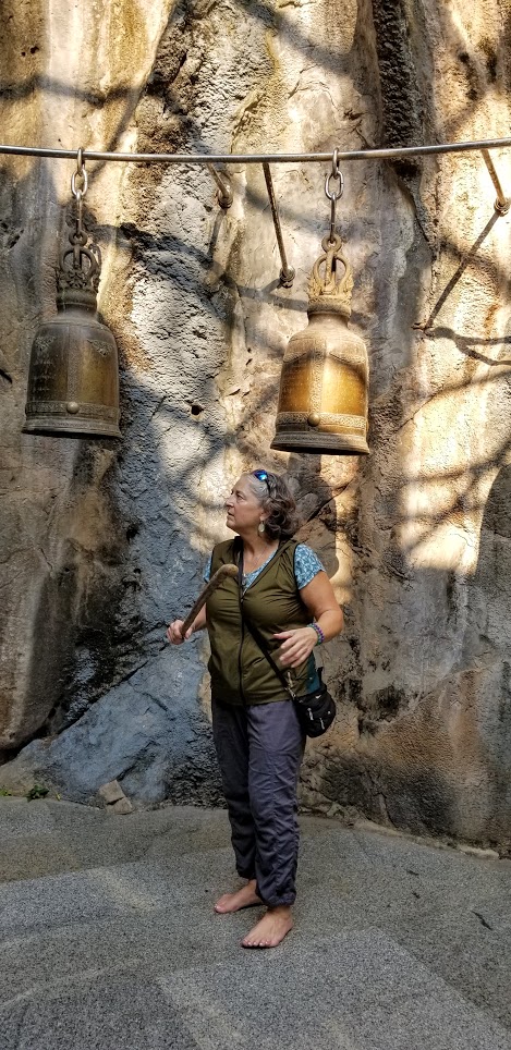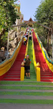 We stopped at a wonderful restaurant on the Kwai river for lunch and visited the Tiger Temple. There are actually several temple’s that are built high up on a mountain top that can be reached by climbing the steep colored staircase or you can choose to ride the funicular. Once I climbed to the top of the stairs, several of us climbed nine floors to the top of a beautiful pyramid shaped Temple. The winding staircases led us to unique art pieces, Buddha statues and mural paintings on the walls depicting Thailand history on each floor. The Duomo shaped ceiling at the top enclosed what looked like a golden ornate alter. One of the students on the trip indicated that there were actual Buddha relics inside. The views of the rice paddy fields below were spectacular.