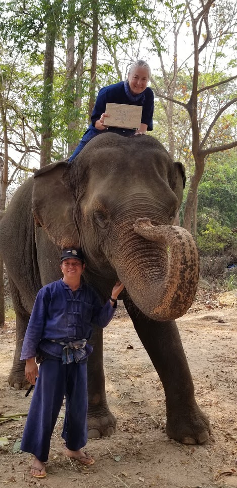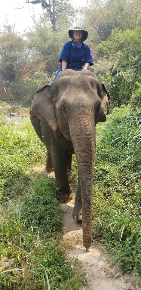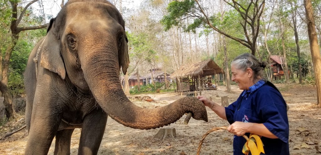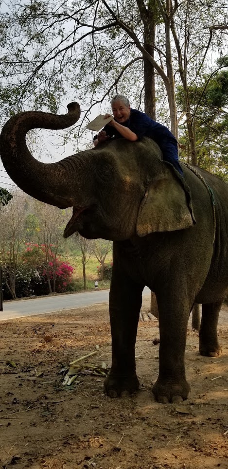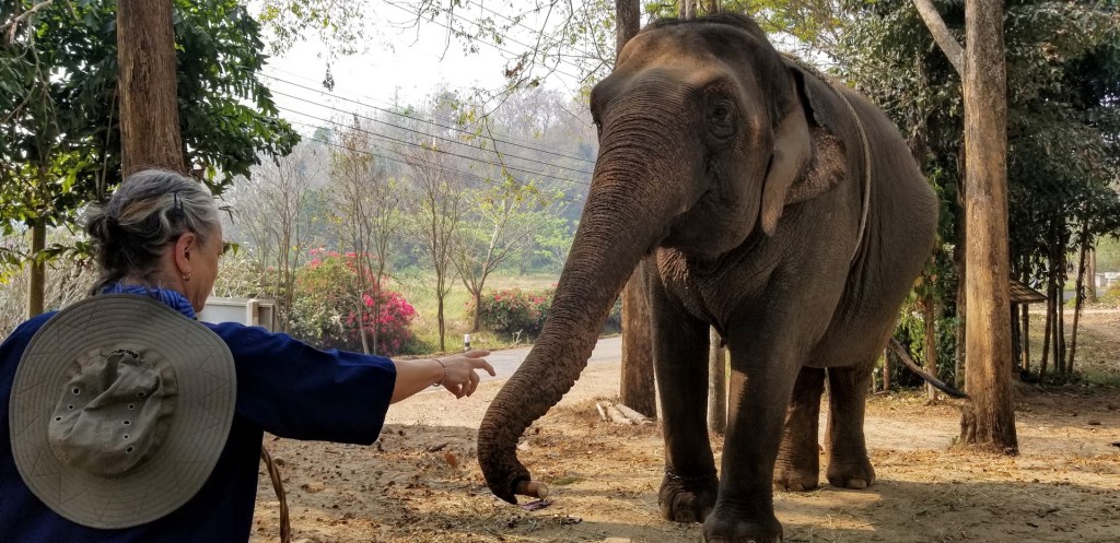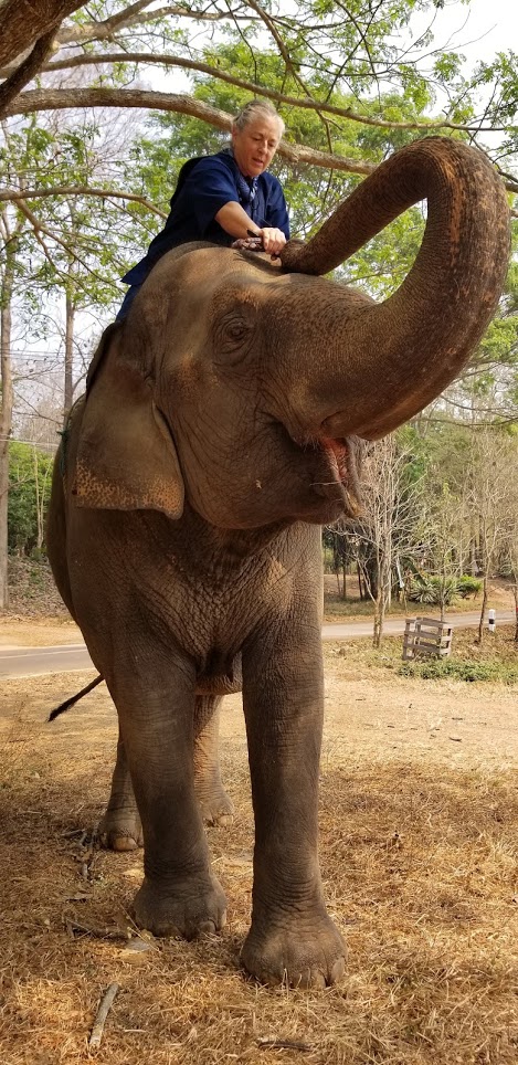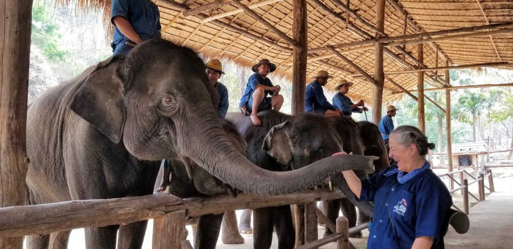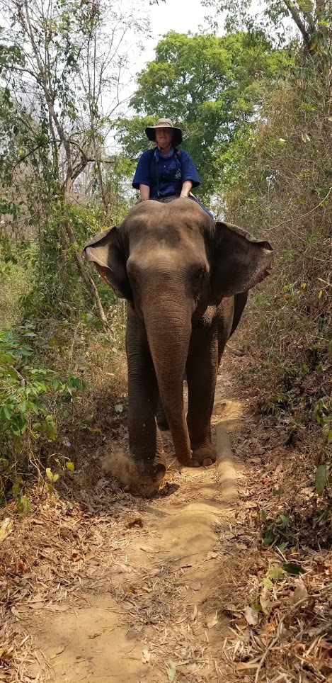 I re-mounted Pumpuang and trekked about a mile to the main part of the center to tour the elephant hospital. On the way, the terrain was very rocky and steep in places and I had to keep repeating “Bai” = Go forward since she liked to stop along the way to feed on the enticing vegetation. It may have been my imagination, but I felt like Pumpuang embraced her ears around my legs tightly to hold me on when climbing up hills. As a government run organization, the hospital treats any elephant whether privately owned or housed on the property free of charge. There were elephants with cancer, teeth issues and even a baby elephant getting an IV who had stomach problems. Next door to the hospital, we visited the ‘old elephant home’ and saw “Daoreuag” who is the oldest elephant housed there at 75 years old.
