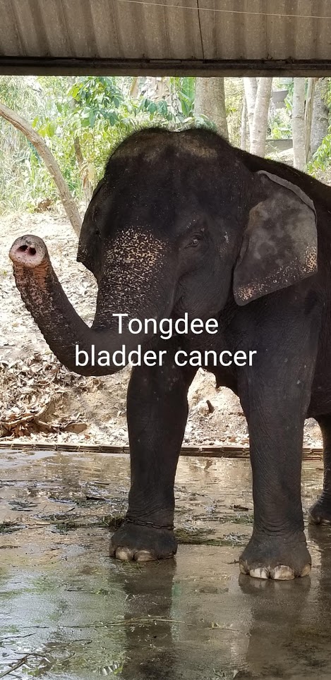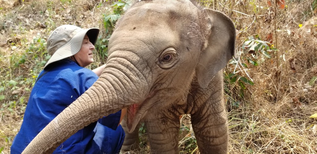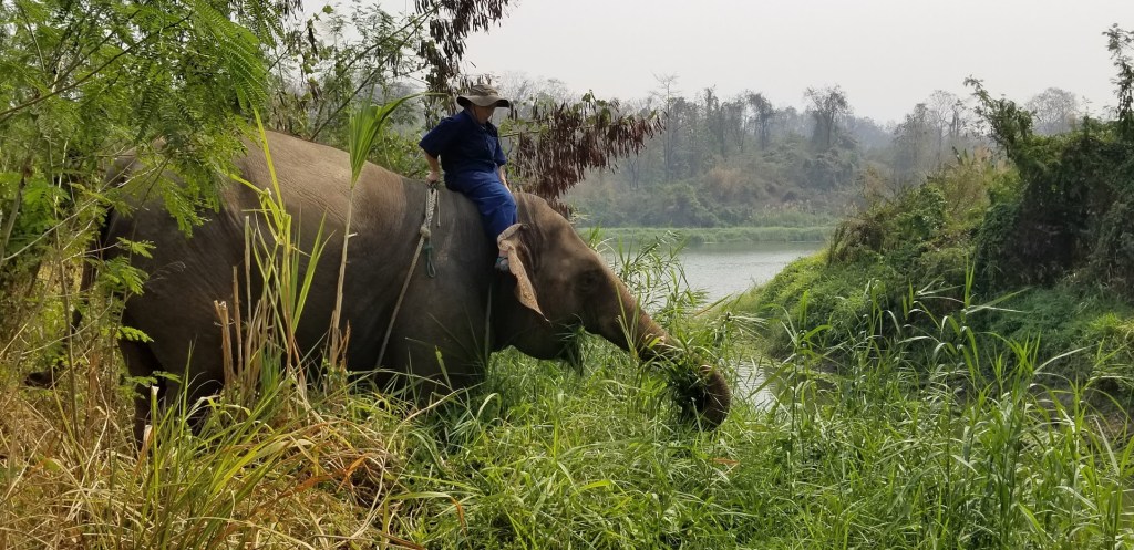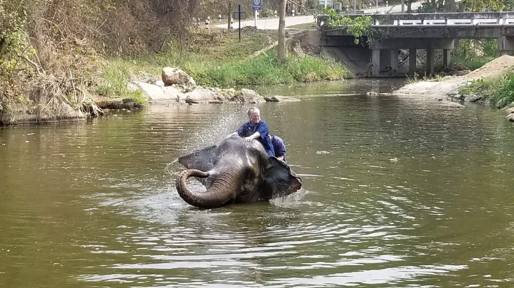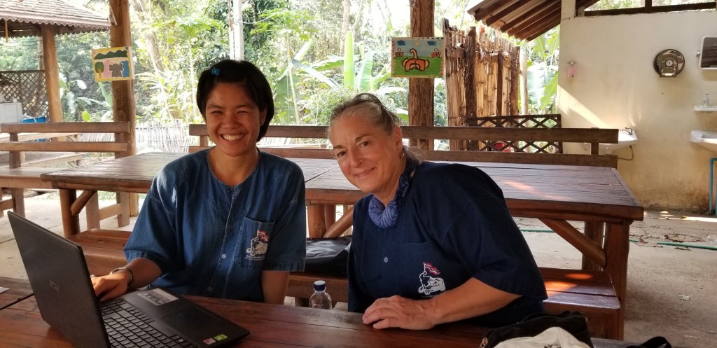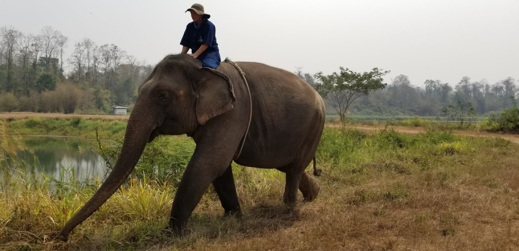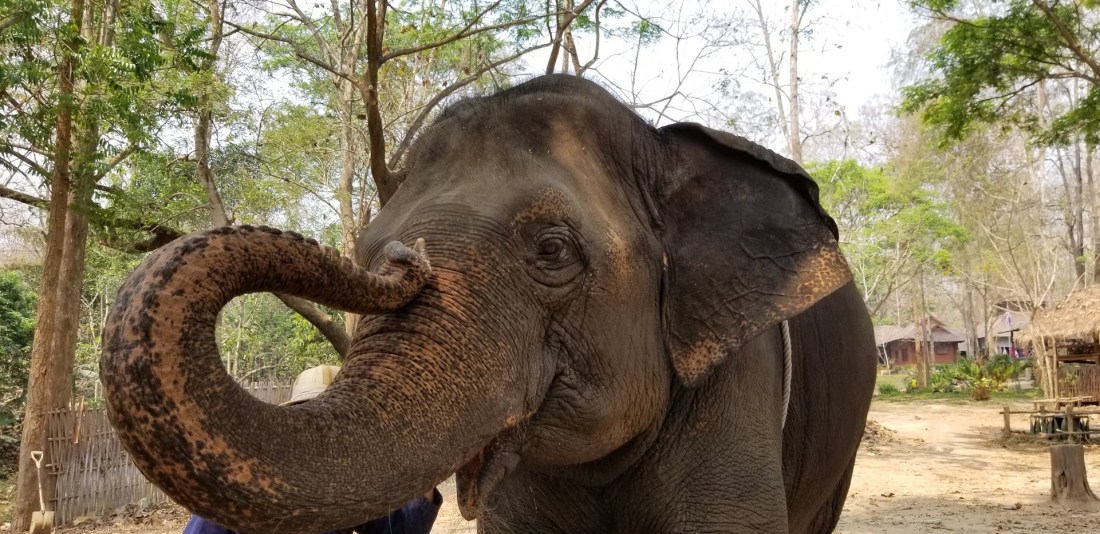 I re-mounted Pumpuang and trekked about a mile to the main part of the center to tour the elephant hospital. On the way, the terrain was very rocky and steep in places and I had to keep repeating “Bai” = Go forward since she liked to stop along the way to feed on the enticing vegetation. It may have been my imagination, but I felt like Pumpuang embraced her ears around my legs tightly to hold me on when climbing up hills. As a government run organization, the hospital treats any elephant whether privately owned or housed on the property free of charge. There were elephants with cancer, teeth issues and even a baby elephant getting an IV who had stomach problems. Next door to the hospital, we visited the ‘old elephant home’ and saw “Daoreuag” who is the oldest elephant housed there at 75 years old.