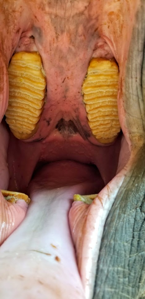 After visiting the hospital we had lunch then visited with the elephants that perform for visitors to the center and watched them get bathed by their mahouts. I was shocked to see the inside of this young (4 year old) elephants mouth with so few teeth to chew the hard sugarcane and whole bananas!