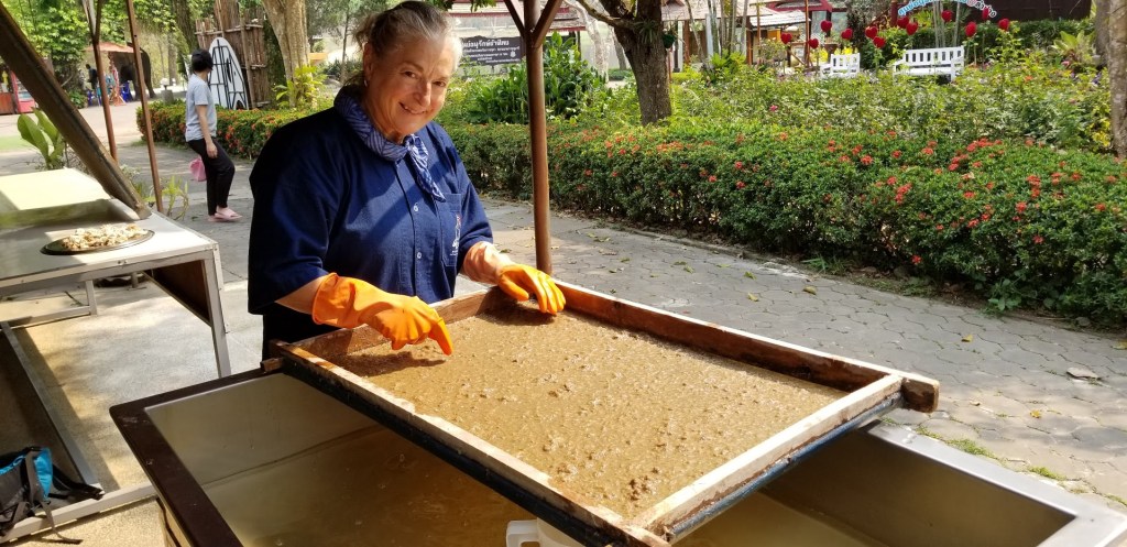 I can add to my resume that I learned how to make paper out of elephant dung! Afterwards, I mounted Pumpuang for the third time and bathed her before trekking back to our starting point a mile away. I’ve never laughed so hard and was completely soaked after being sprayed with water during the bath, but it felt so good on our hot trek back to the training center.