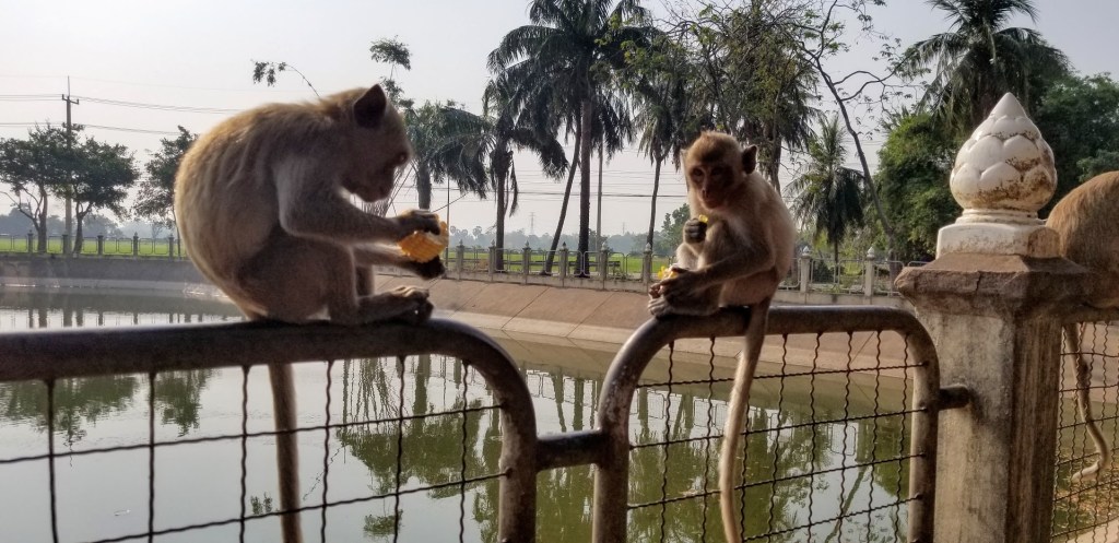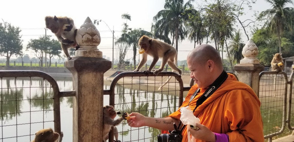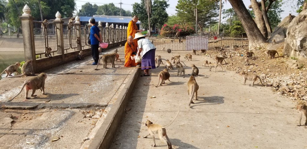 On the pathway walking back to the songtaew, there were many monkeys on the guard wall and trees. I witnessed a monkey try to grab one of the students backpack but only came away with some Kleenex. Then I learn when I got back to the bus that my seating partner got bit by a monkey! He is doing ok, but is taking the rabies shot series to be on the safe side.