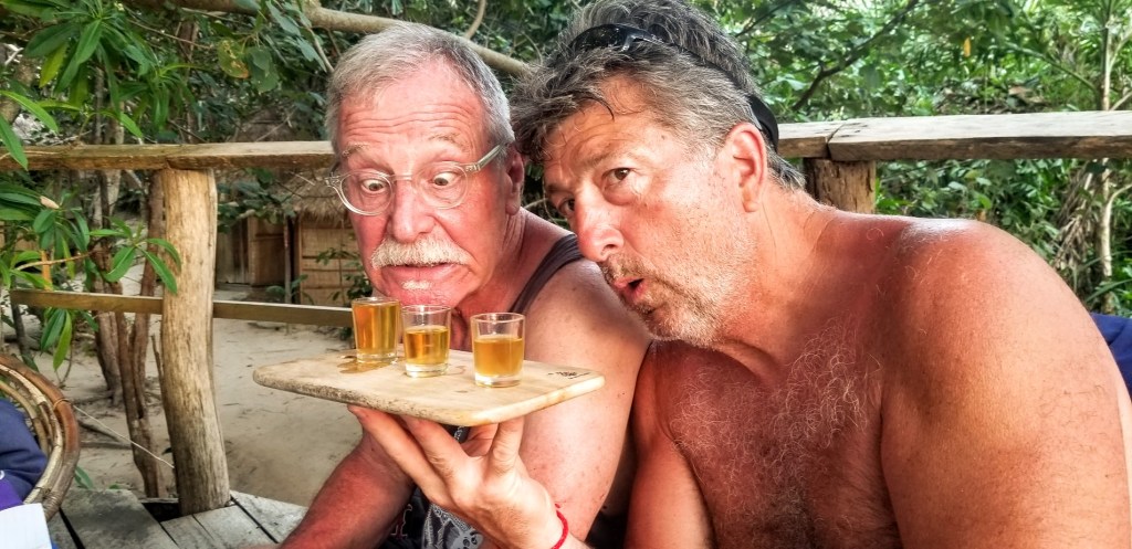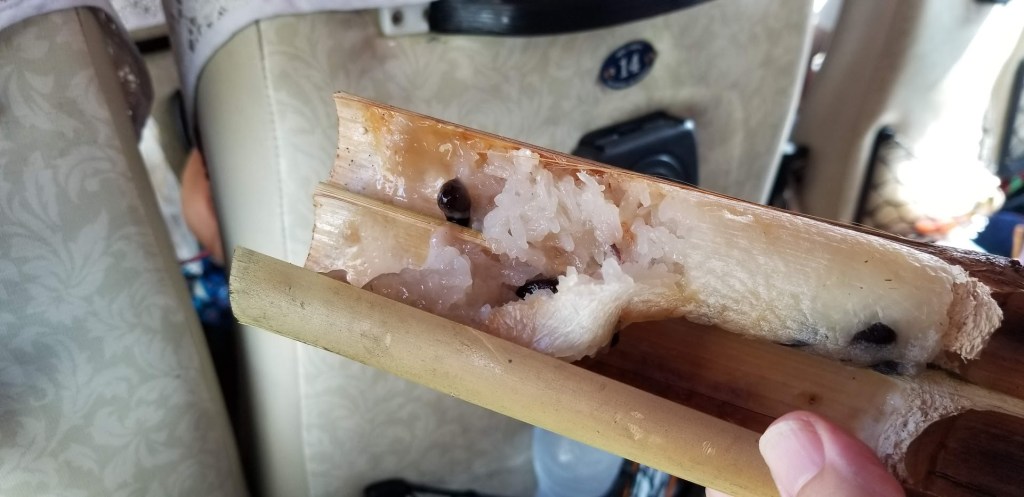 Back on the bus, I was given a warm Bamboo Tube that was delicious! Stuffed inside the bamboo is sticky rice mixed with sugar, sweet red beans and coconut cream, then slow roasted over coals to slowly cook and mix the ingredients together. Yummo!