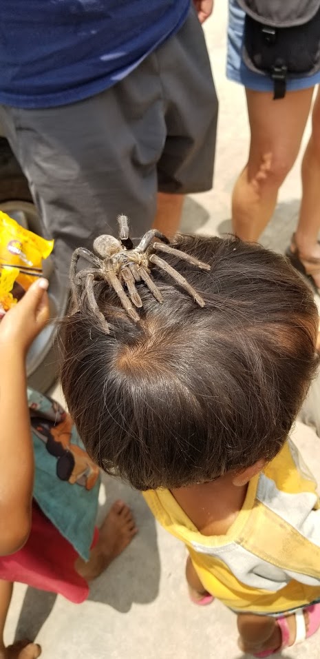 We hired a mini-van to drive us from Siem Reap to Phnom Penh, the capital city of Cambodia. The 6 hour drive was just about the scariest thing I’ve ever done . . . it gives a whole new meaning to the song “Jesus take the wheel”. The two-way highway was crowded with slow moving semi-trucks on the road and motor bikes kicking up clay dust on the sides. Our driver was very talented at weaving in and out of the lane to on-coming traffic and passing one, two or three semi-trucks at a time! We took a “potty” break at the spider stop – yikes. Fortunately, we made it to Phnom Penh safely and enjoyed some of the sights during our one night stay.